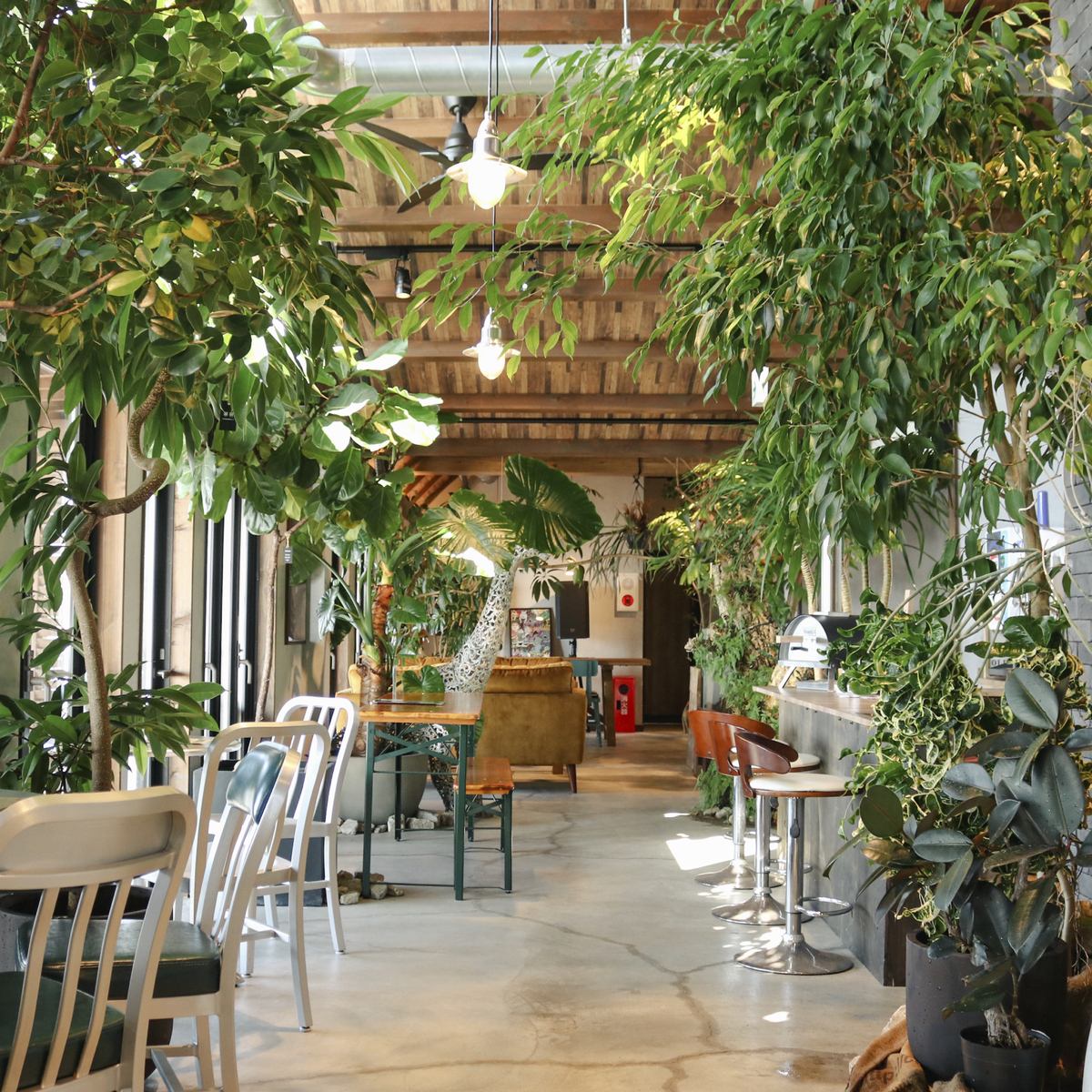 【店内の雰囲気】 店内は、みどりと海が調和する心地よい空間。希少種や美しい樹形の植物を配し、家具は上質なプロダクトで知られるDULTONをセレクト。落ち着きある雰囲気のなかで、ゆったりとカフェをお楽しみいただけます。